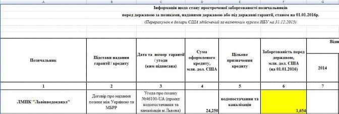 У 2002-му році комунальне підприємство «Львівводоканал» уклало із Міжнародним банком реконструкції та розвитку (МБРР) угоду про позику розміром 24,25 млн доларів США. Отримані кошти спрямували на те, щоб вирішити проблему з погодинною подачею води в місті. «Львівводоканал» позики не повернув. Відповідно, кредит МБРР сплачував Кабінет Міністрів, який був гарантом цієї угоди.