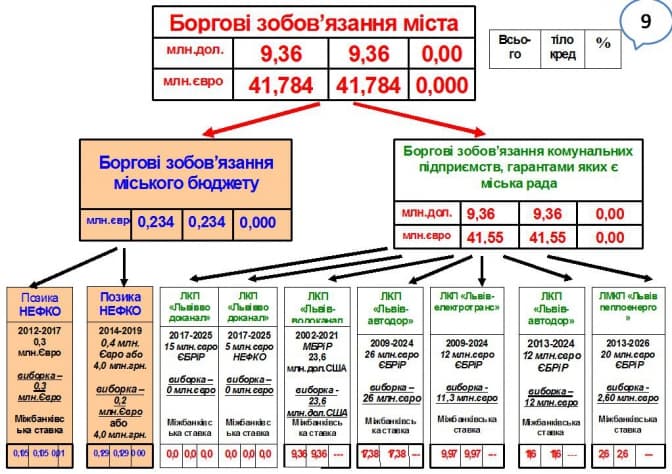 Зокрема, у презентації Проекту бюджету розвитку Львова на 2017-й рік йшлося про боргові зобов’язання комунальних підприємств, гарантом яких є Львівська міська рада. Серед переліку – й ЛКП «Львівводоканал», яке має боргові зобов’язання у розмірі 23,6 млн доларів, які виплачуватиме до 2021-го року.