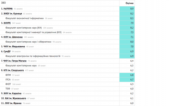 Ресурс DOU вже втретє оприлюднив рейтинг вишів з IT-спеціальностей. Вони опитали 2938 спеціалістів, які працюють зараз в IT та які вчилися в українських університетах, незалежно від того, отримали диплом чи ні. У трійці лідерів опинилися два харківські університети, а очолює рейтинг вже третій рік поспіль НаУКМА.
