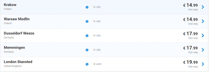 Зі знижкою можна придбати квитки на рейси з 22 травня до 11 липня. Зі Львова за 15 євро можна полетіти у Краків або Варшаву у липні, а за 18 євро – у липневі Дюссельдорф і Меммінген. Квитки у Лондон від 18 євро можна придбати на травневі рейси.