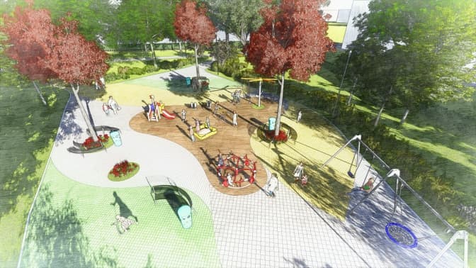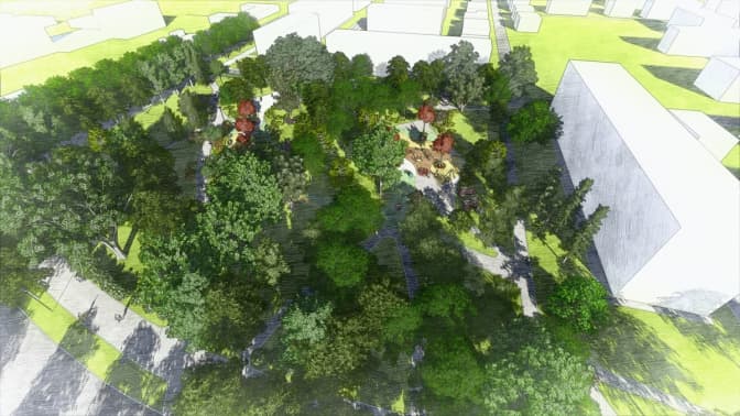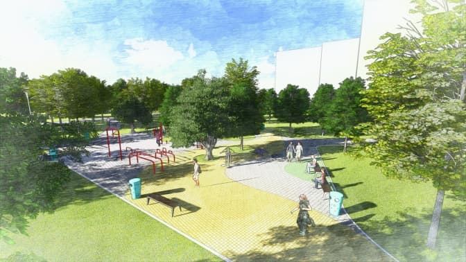 Так виглядає загальний план оновленого скверу. Доріжки загалом лишаються на нинішніх місцях – вони прокладені цілком зручно і лише потребують оновлення. Також мешканці під час зустрічі на місці підкинули ідею облаштувати у лівій (меншій) частині скверу невеликий баскетбольний майданчик.