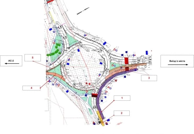 Додаткова смуга не мала б бути в межах кільця, а плавно входити у смугу, що веде до вул. Б. Хмельницького на виїзді з міста (на схемі цифра 1), а дві смуги залишити для виїзду з кільця. Одна з них мала б бути лише для громадського транспорту (на схемі цифра 2).