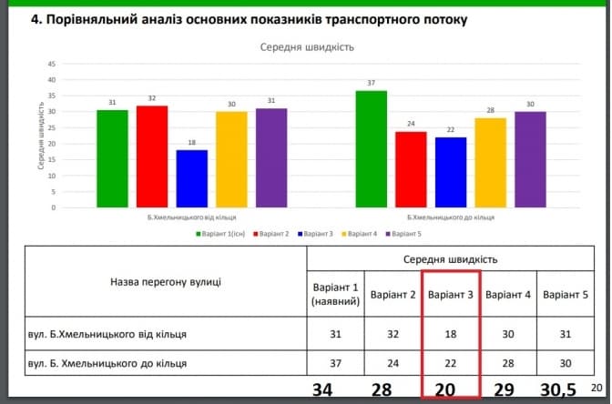 Із цього слайда бачимо, що до влаштування квазікільця середня швидкість на вул. Б. Хмельницького була 34 км. Якщо запустити квазікільце із світлофорами, то швидкість зменшується до 20 км. Найкращим варіантом є запровадження одностороннього руху на всій ділянці квазікільця (Варіант 5) – матимемо швидкість руху 30,5 км.