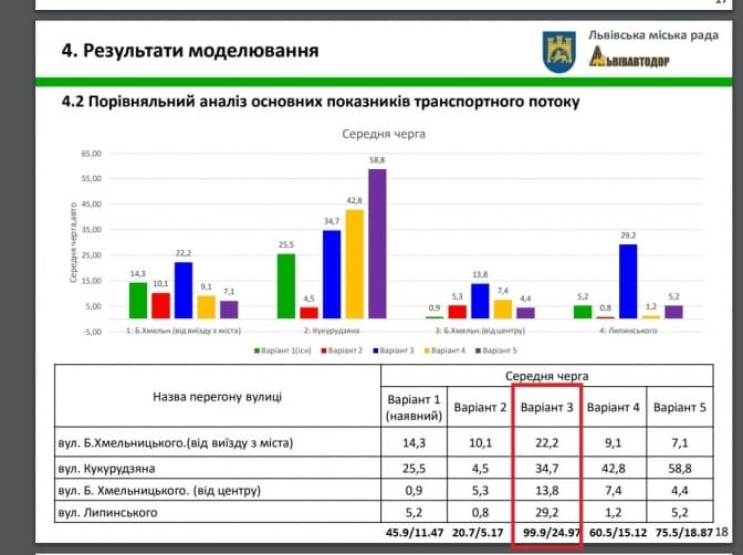 Варіант 4 – передбачає всі зміни, подані у Варіанті 2, однак пропонується індивідуальний транспорт, який рухається вул. Б. Хмельницького до кільця, скеровувати праворуч – на вул. Кукурудзяна, а громадський транспорт буде рухатися прямо.