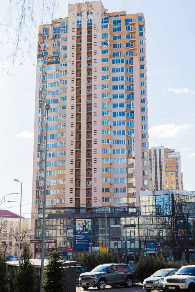 Разом з Оленою піднімаємося на 25 поверх, звідки відкривається чудовий краєвид Києва. Поряд квартири, які теж постраждали від вибуху. У когось повибивало вікна уламками, у когось – ударною хвилею. Зараз їх уже замінили на нові.