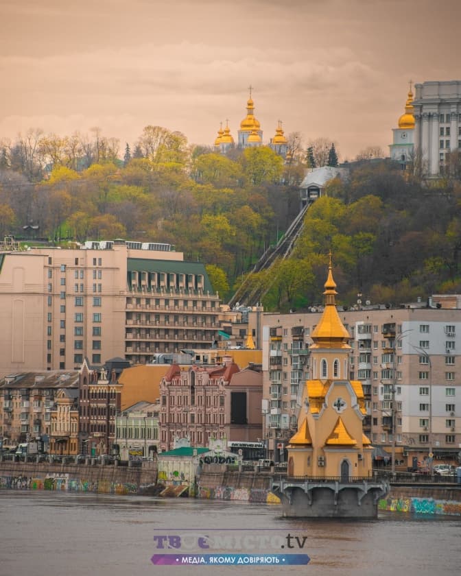 Вид з Труханового острова на Набережно-Хрещатицьку вулицю (на передньому плані церква Миколи Чудотворця на воді)