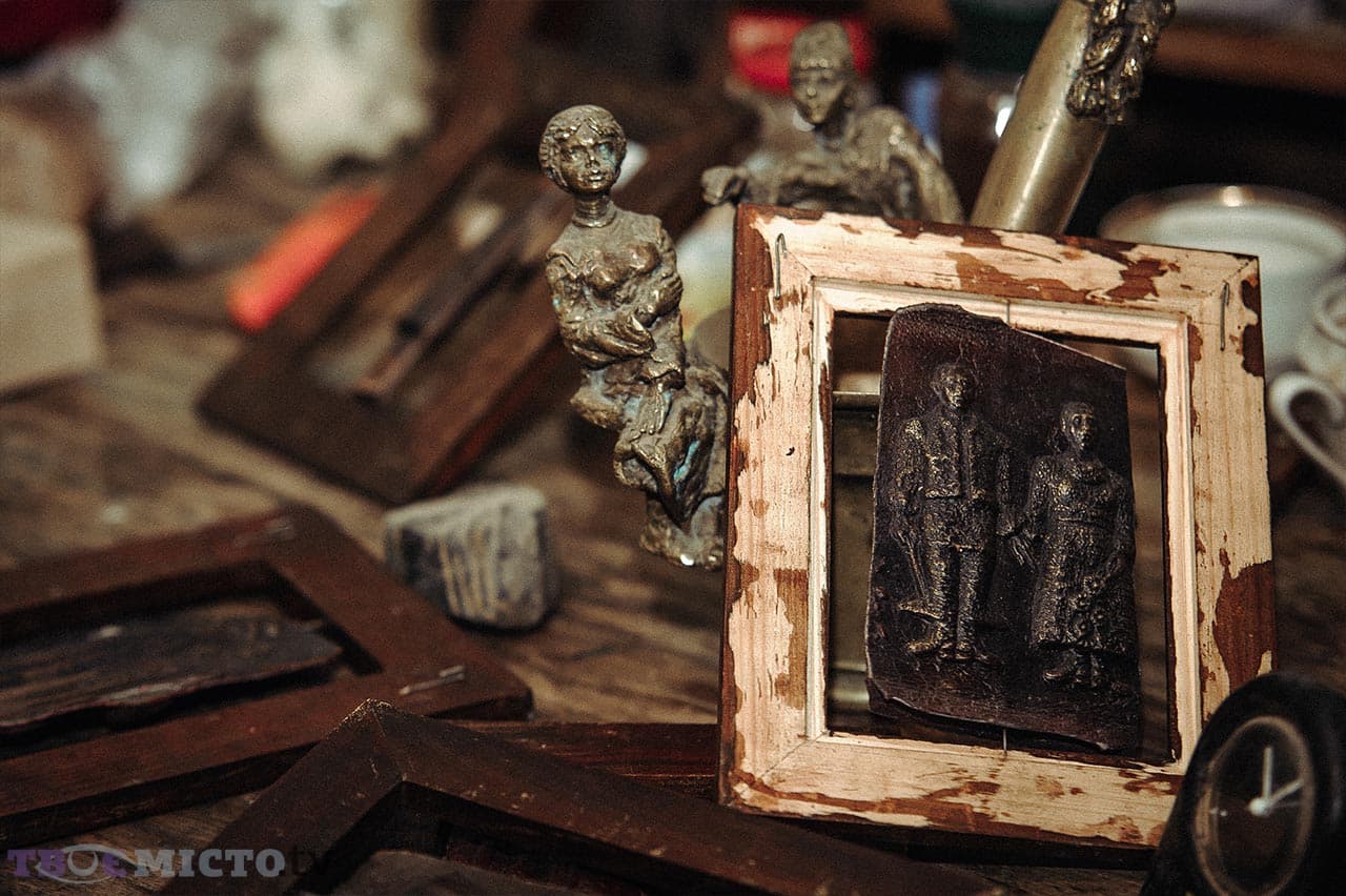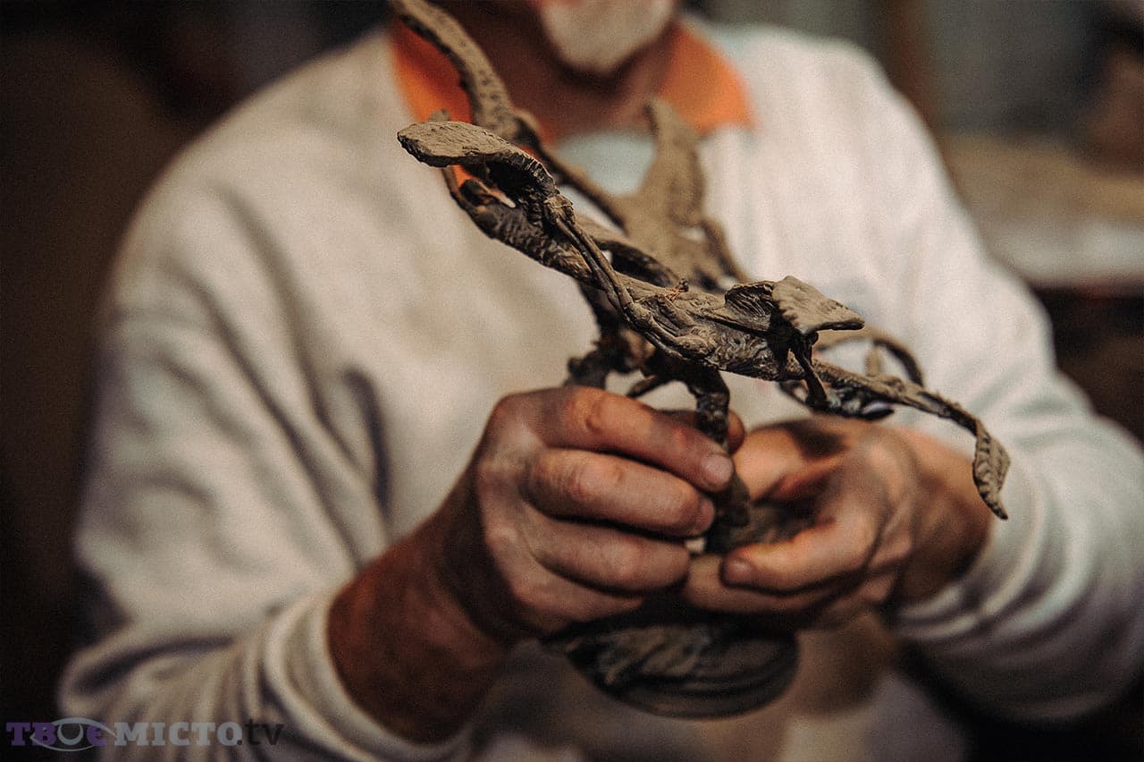 Було багато помилок. Спочатку вирізав кліше з дерева. Тепер виливаю з алюмінію. Я зрозумів, що в дошці того не зробиш, що можна виливати з металу. Шкіра спочатку мала купу бульок. Я так злився, не міг здогадатися, як позбавитися тих бульок. А виявляється, треба було просто долити води і вона витіснить зайве повітря.