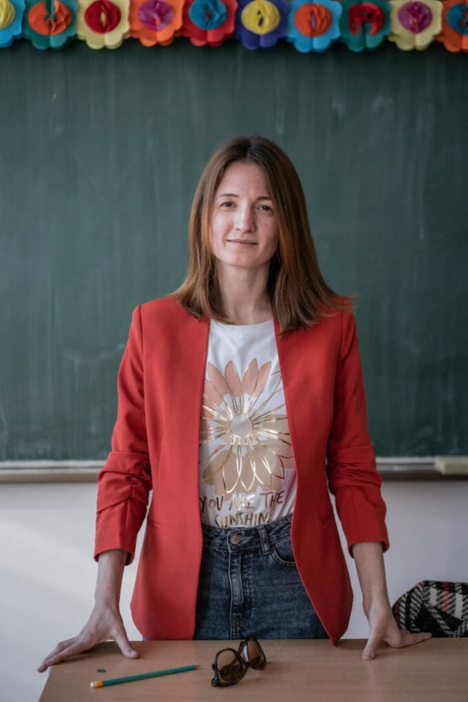 Вісім українських вчителів тримають в руках аркуші формату А4 з номерами класів, які візьмуть. Разом вони увійшли в будівлю середньої школи. Це вчителі з Одеси, які знайшли будинок у Брагадіру і живуть там разом з деякими учнями та їхніми матерями. Серед них Анастасія Коновалова, вчителька англійської мови, заступниця директора приватної школи «Insula» в Одесі («Острівець»).