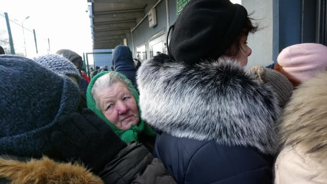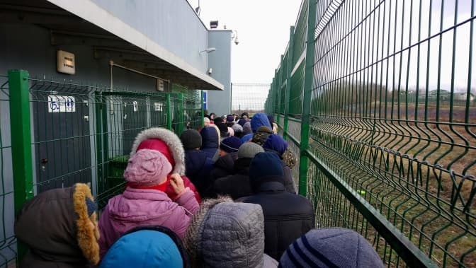 Нуль градусів. Змерзлі й скоцюрблені люди переминаються на ногах, наче перед сальсою. Порив вітру намагається здирати каптури з чоловічих голів. Людей із валізами чи наплічниками майже немає – в усіх пакети чи сумки через плече. Більшість людей у черзі – літні, та, попри холоднечу, жваво спілкуються.