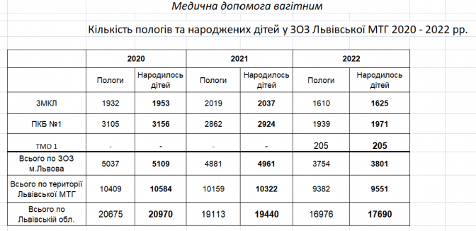 У минулому році кількість пологів була ще меншою: в 3-ому пологовому народилося 1625 дітей (1610 пологів), а в 1-ому – 1971 дитина (1939 пологів). Іще 205 дітей народилися в Першому ТМО. Загалом у Львові за 2022 рік прийняли 3754 пологи (3801 дитина). Знизився рівень народжуваності й у Львівській області – торік прийняли 16 976 пологів, народилося 17 690 дітей.