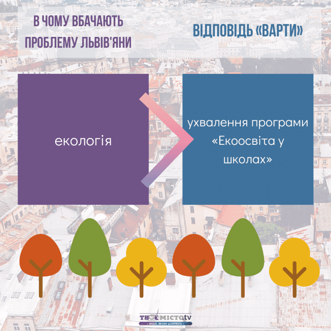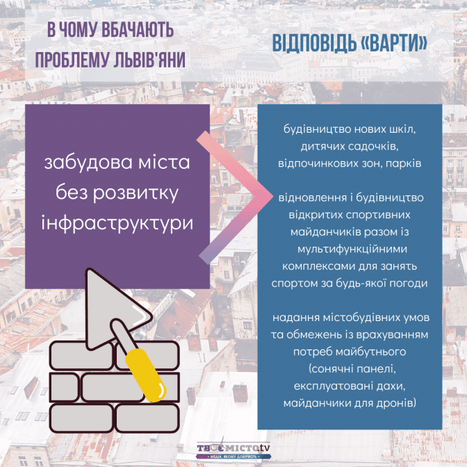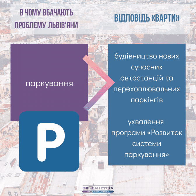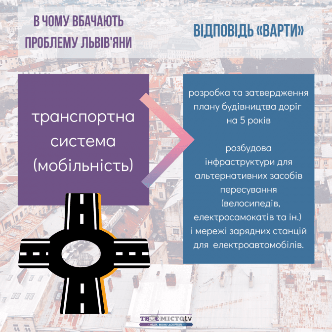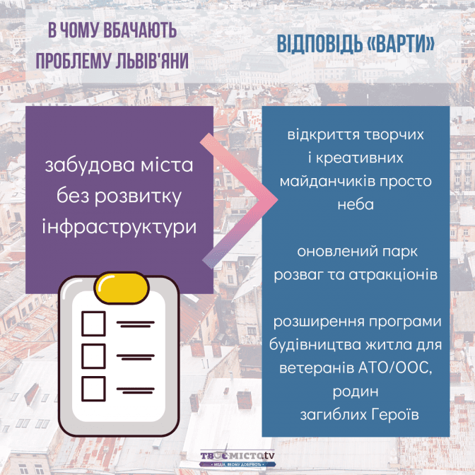 Tvoemisto.tv також пропонує читачам ознайомитись із аналізом програм кандидатів на голову Львівської ОТГ за ключовими проблемами міста, які бачать члени спільноти «Твого міста»: