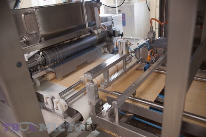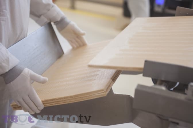 «Потім робиться такий собі сендвіч, ми можемо регулювати кількість шарів, залежно від наших потреб. Далі все зважується – це важливо, бо від цього буде залежати вага готової продукції. Опісля пласт охолоджується і ріжеться», – пояснює наш гід.