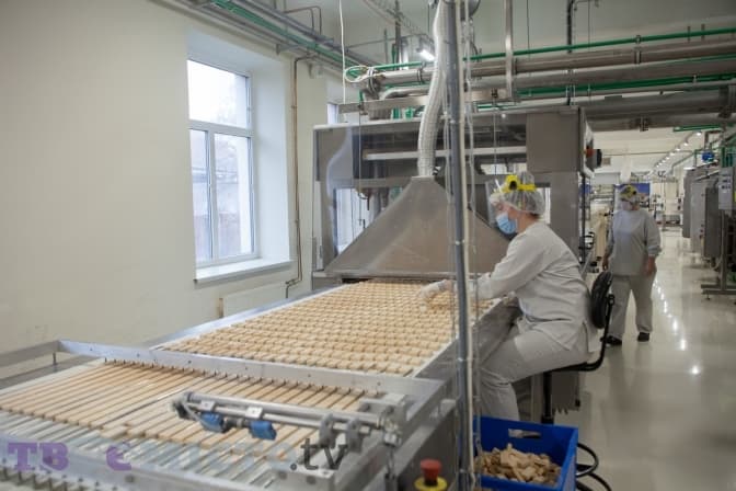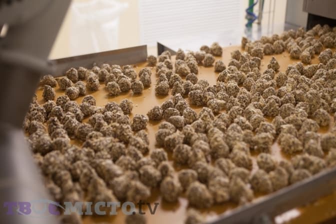 «Із попередньо підготовленої начинки дозатор робить куполоподібні цукерки. Потім їх охолоджують і покривають глазур’ю. Поки вона не застигла, потрібно обсипати цукерки вафельною крихтою. Спеціальні «пальці» перемішують їх у крихті, щоб покрити з усіх боків. Далі – знову холодильний тунель, металодетектор і пакувальна зона», – веде екскурсію Сергій Латін.