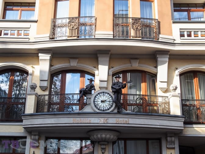 2012 року на цьому місці звели готель Nobilis. Він стоїть фасадом до вулиці Фредра, а на Герцена виходить балкон із годинником. На другому поверсі сидить панянка з віялом, поруч – молодик із гітарою, а між ними — годинник.