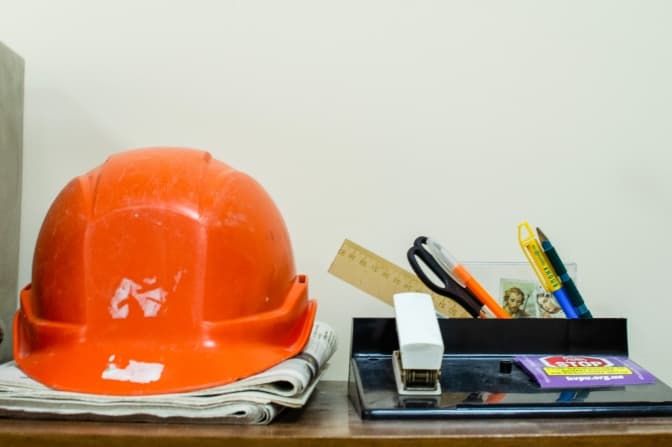 На одній з полиць зауважую полум’яно-помаранчеву каску. Вона акуратно стоїть на стосику газет.