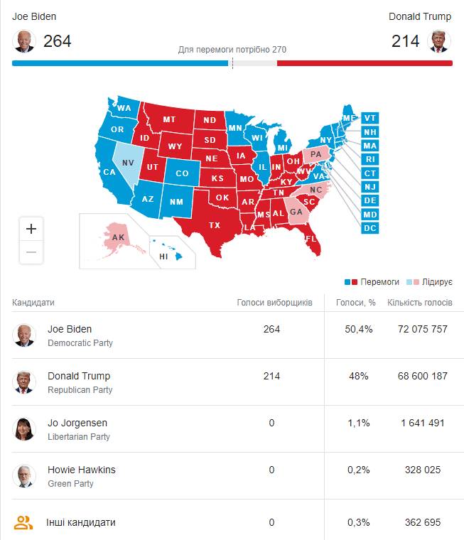 Станом на ранок сьогодні, 5 листопада, їхні результати – 264 проти 214 голосів, відповідно. Так, Джо Байдену залишилося набрати всього шість голосів для перемоги на виборах президента США.