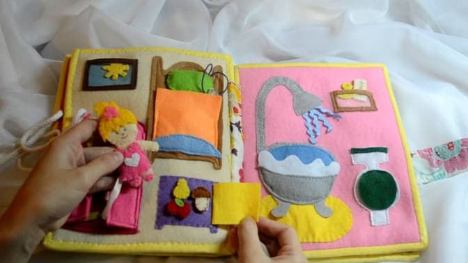 М’які розвиваючі книги. Іграшку можна зробити самотужки – із фетру чи іншої тканини. Кожна сторінка м’якої книги – це окремий інтерактивний урок з цікавими персонажами, загадками чи завданнями. Деякі елементи рухомі та зйомні, сторінки з’єднані між собою шнурівками, часто під час гри використовують ґудзики та намистинки.