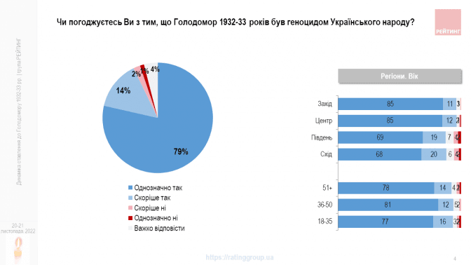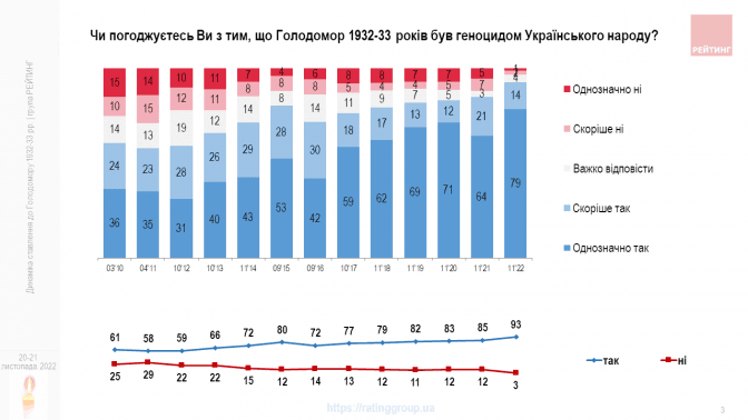 «За останні десять років відбулося зростання у півтори рази кількості респондентів, які погоджуються з тезою про те, що Голодомор 1932-33 років є геноцидом українського народу (у порівнянні із минулим роком – зростання на 8 в.п.). Голодомор 1932-33 рр. визнають геноцидом абсолютна більшість мешканців як західних, центральних, так і південно-східних областей країни. Також не зафіксували значимих відхилень у вікових розподілах у цьому питанні», – йдеться в повідомленні.
