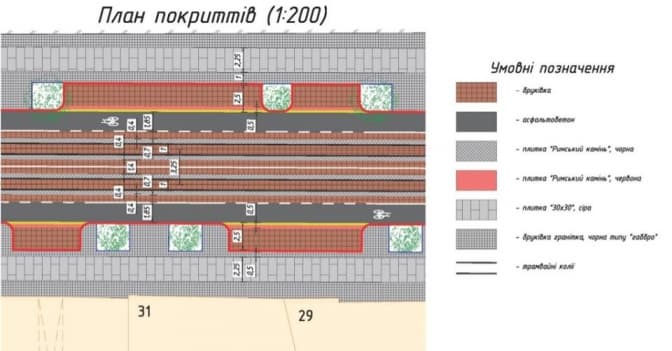 ГО «Зручне місто» опублікувало на своїй сторінці у Facebook план покриттів вулиці, за яким бруківку залишать у кишенях для паркування та біля колій. Асфальтованими залишать велосмуги по 185 см, які передбачені вздовж усієї вулиці. На хідниках прокладуть гладку тротуарну плитку.