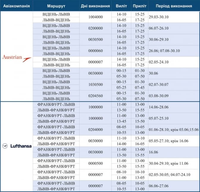 Найбільша авіакомпанія Німеччини та Європи Lufthansa та австрійська авіакомпанія Austrian Airlines із аеропорту «Львів» збільшила кількість рейсів до Франкфурта та Відня, повідомляє Міжнародний аеропорт «Львів».
