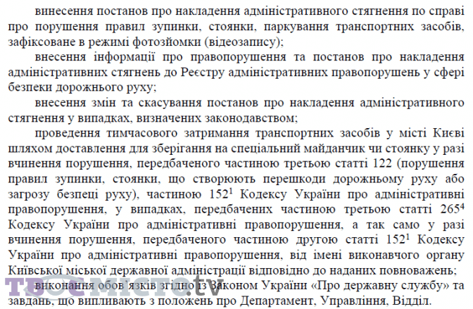 – розгляд справи про адміністративні правопорушення, передбачені частинами першою і третьою статті 122, частинами першою, другою статті 152 1Кодексу України про адміністративні правопорушення від імені виконавчого органу Київської міської державної адміністрації відповідно до наданих повноважень: застосування автоматизованої системи контролю оплати вартості послуг з паркування транспортних засобів; виявлення та фіксація у режимі фотозйомки (відеозапису) порушень правил зупинки, стоянки, паркування транспортних засобів;