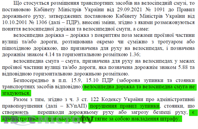 «Безпосередньо в п.п. 15.9, 15.10 ПДР (заборона зупинки та стоянки транспортних засобів відповідно) велосипедна доріжка та велосипедна смуга не згадуються», – пишуть у Департаменті.