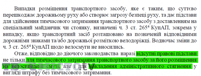 «Відповідно до діючого законодавства наразі відсутні правові підстави не тільки для тимчасового затримання транспортного засобу за його розміщення на велосипедній смузі, але і для накладення адміністративного стягнення у вигляді штрафу без тимчасового затримання», – йдеться у відповіді.