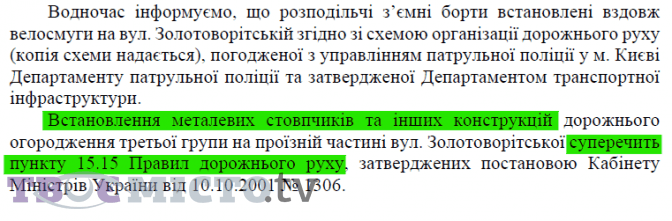 «Встановлення металевих стовпчиків та інших конструкцій дорожнього огородження третьої групи на проїзній частині вул. Золотоворітської суперечить пункту 15.15 Правил дорожнього руху, затверджених постановою Кабінету Міністрів України від 10.10.2001 No 1306», – пояснюють у Департаменті неможливість встановлення інших огороджень.