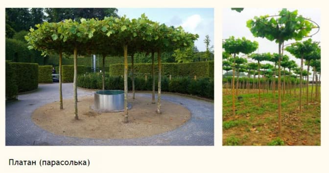 Серед тих дерев будуть 2 платани-парасольки (досі у Львові їх можна будо побачити лине на приватних ділянках). Крона дерева утворює природну парасолю.