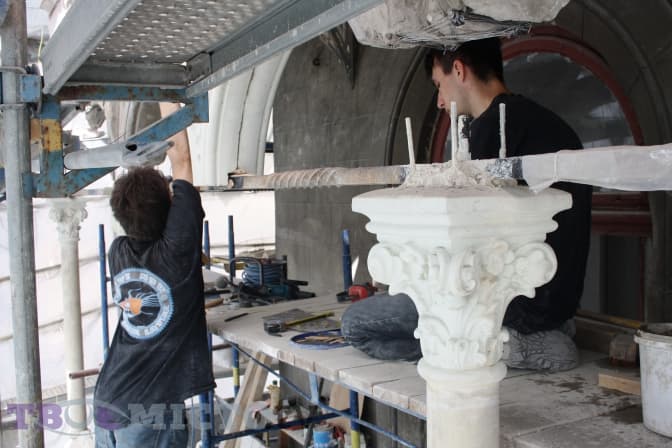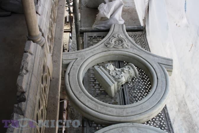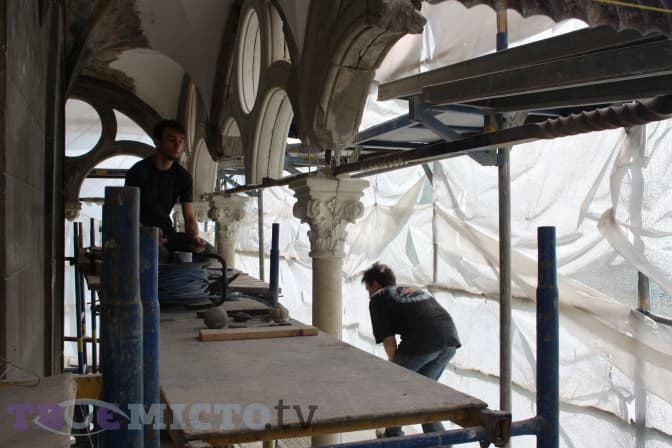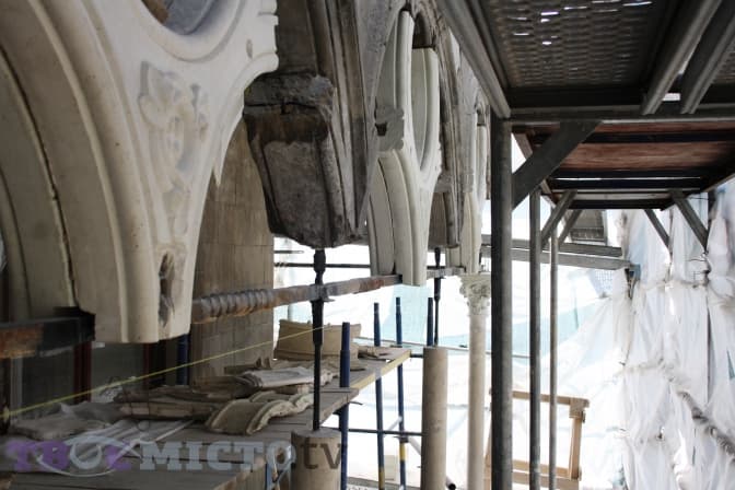 «Зазвичай під час реставрації прийнято все зберігати та мінімально змінювати, однак в цьому випадку було вирішено замінити більшість елементів балкону на нові, а не склеювати старі», — розповідає Андрій Федоришин. — «Через те, що біля палацу пролягає трамвайна колія, відбуваються постійні вібрації під час руху транспорту, тому у разі склеювання ці конструкції через деякий час могли почати руйнуватись знову».