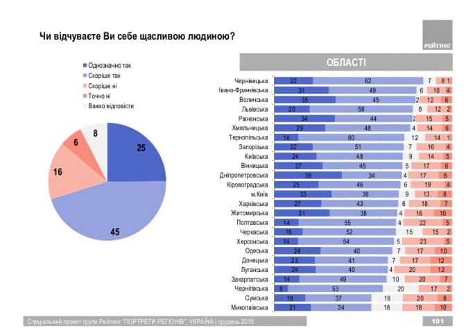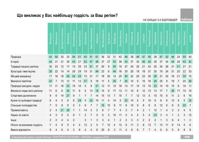 Соціологічна група «Рейтинг» у рамках проекту «Портрети регіонів» з 16 листопада по 10 грудня 2018 року провела опитування серед громадян України віком старше 18-ти. У дослідженні, зокрема, визначили, чим найбільше пишаються мешканці областей.
