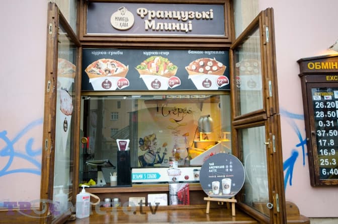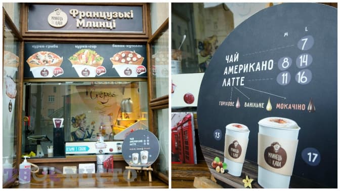 Пропонують у закладі млинці трьох видів: курка-гриби (31 грн), курка-сир (25 грн), а також банан-нутелла (22 грн). Також можна замовити чай та каву. Кава є двох видів – американо та лате. Ціна від 8 до 16 гривень.