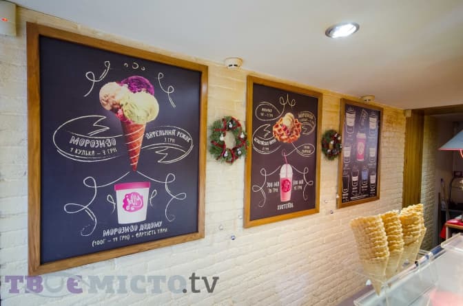 Дизайн виконано у рожево-білих тонах. Така гама переважає як в інтер’єрі, так і в чашках для кави, баночках, в які можна взяти морозиво з собою.