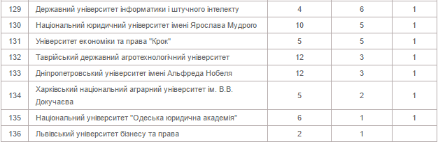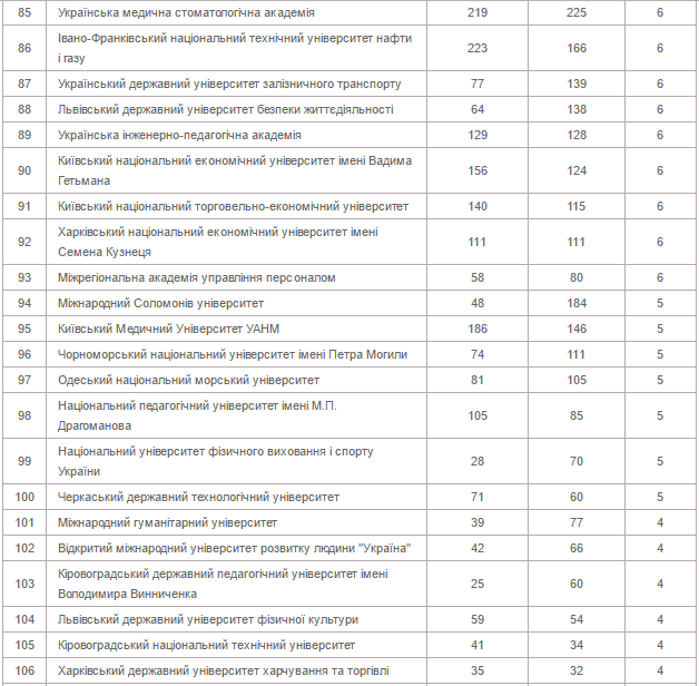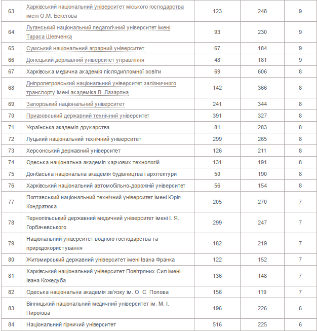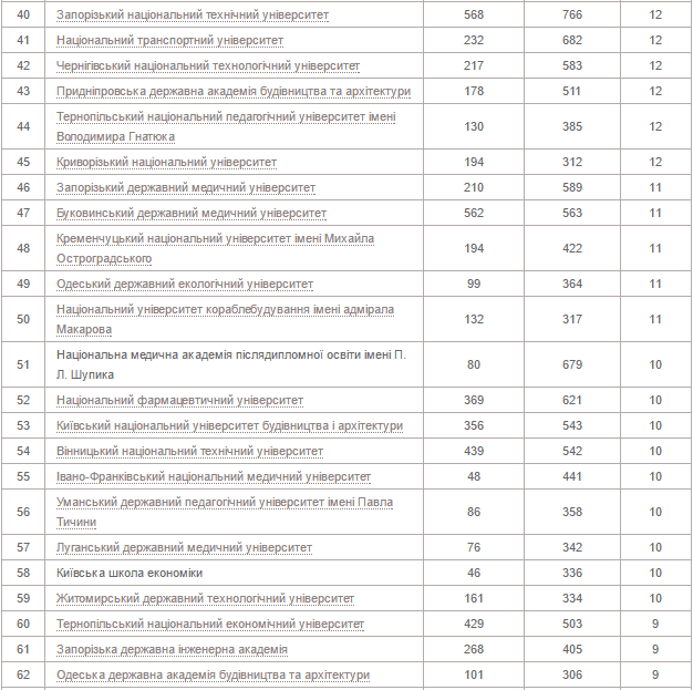 Донецький національний медичний університет ім. Горького (40), Дніпропетровський національний університет ім. Гончара (37) та НТУ "Харківський політехнічний інститут" (36) посіли 7,8 та 9 місце рейтингу.
