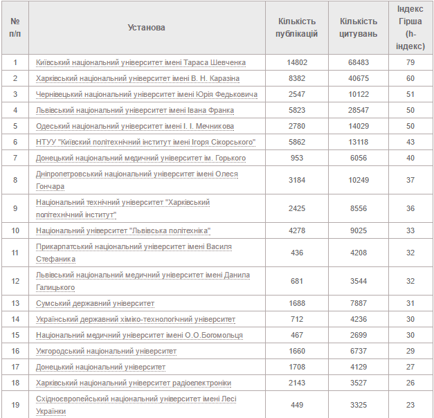 Згідно з даними рейтингу, найвищий індекс Гірша серед університетів України мають Київський національний університет ім. Шевченка — 79 (73 у рейтингу 2016 року), Харківський національний університет ім. Каразіна — 60 (57) та Чернівецький національний університет ім. Федьковича — 51 (44).