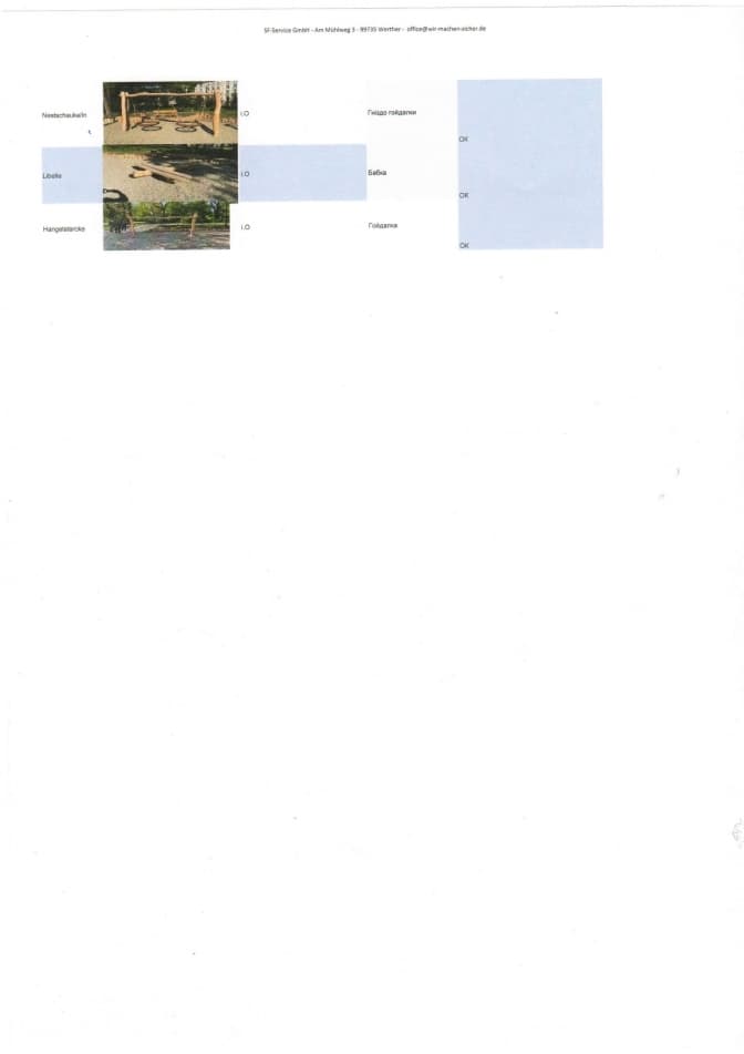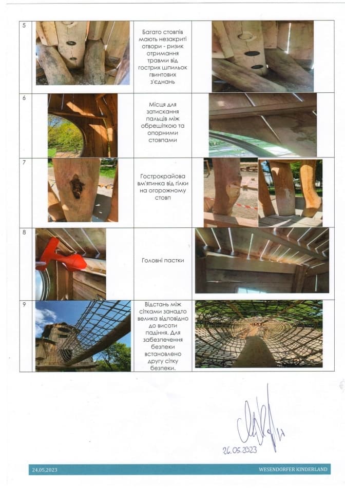 «Під час експертизи знайшли декілька маленьких недоліків – 9 штук. Вони не дуже масштабні, але зауваження були. Ось тут ми маємо документ і відразу підготували протокол з виправленими недоліками. Були декілька моментів, де було нешліфоване дерево, завелика відстань на перилах, один шуруп наші хлопці забули забрати і сітку на мостик доставили. Це такі не грандіозні зауваження, але вони були. Зараз ми вже все виправили», – зазначив виробник дитячого майданчика Матіас Гьопфнер.