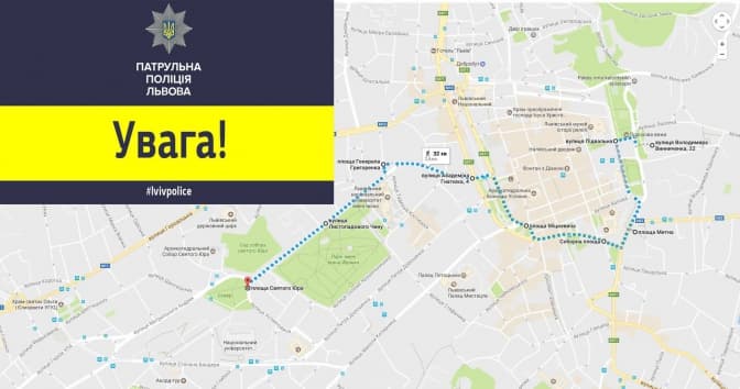 Як повідомили у патрульній поліції Львова, завтра ситуативно перекриють рух транспорту за маршрутом Хресної дороги: вул. В. Винниченка, 22 (храм св. Архистратига Михаїла) – вул. Підвальна – пл. Митна – пл. Соборна – пл. Галицька – пл. А. Міцкевича – просп. Свободи (проти руху) – вул. Академіка В. Гнатюка – пл. Генерала Г. Григоренка – вул. Листопадового Чину – пл. Святого Юра (пам’ятник Праведному Митрополиту Андрею).