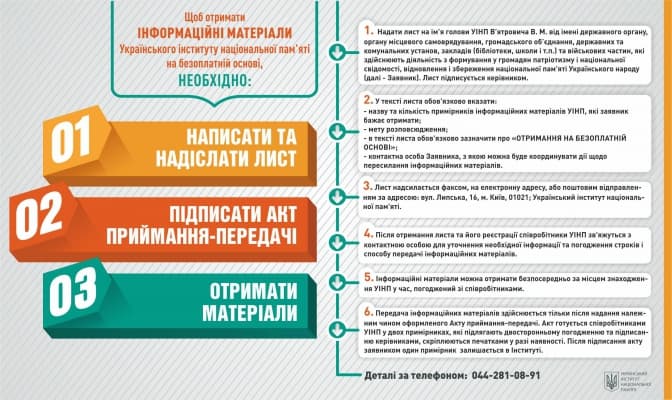 Щоб безоплатно отримати інформаційні брошури у друкованому вигляді для шкіл, музеїв, закладів вищої освіти, військових частин тощо, потрібно написати лист на ім’я голови Інституту Володимира В’ятровича від імені структури-заявника. Лист підписується керівником, а в тексті потрібно обов’язково вказати назву та кількість примірників, які заявник бажає отримати; мету розповсюдження; зазначити про «отримання на безоплатній основі» та залишити свої контактні дані.