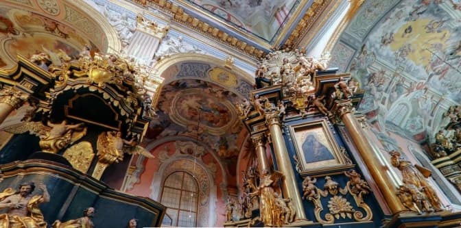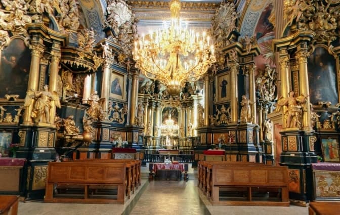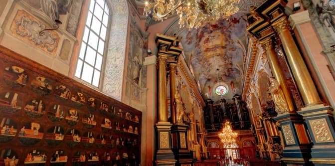 Інтер’єр храму прикрашають дерев’яні різьблені вівтарі, склепіння костелу розписано фресками.