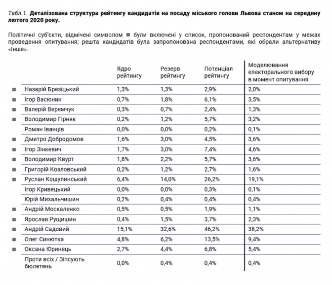 Перші позиції все ще утримує Андрій Садовий попри кількаразові заяви не балотуватися. Його показник моделювання електорального вибору становить 38,2%. Показник ядра рейтингу чинного міського голови становить 15,1%, резерву – 32,6%, а потенціал зростання – 46,2%.