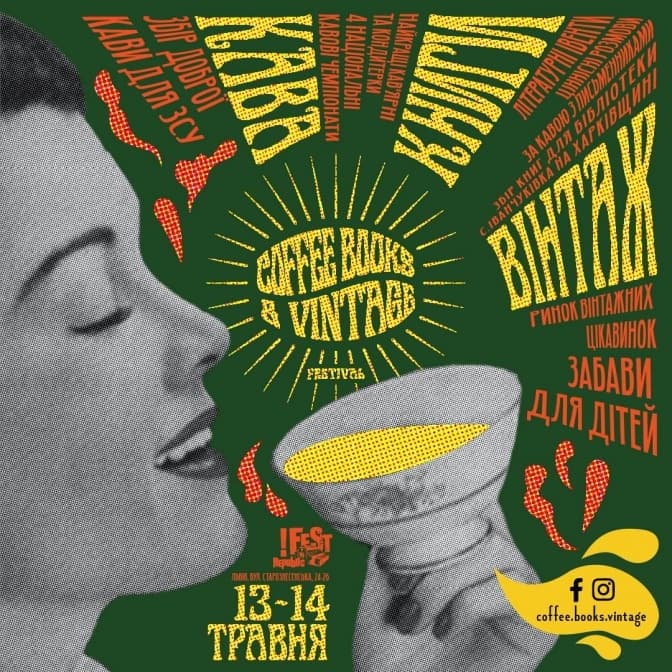 Посиденьки за доброю кавою, кавові чемпіонати, ціннісні розмови, книжковий ярмарок, гарні вінтажні цікавинки для інтер’єру, збір дріпів з доброю кавою, які ми подвоїмо після події та передамо ЗСУ та збір книг для бібліотеки деокупованого села Іванчуківка (Харківщина).