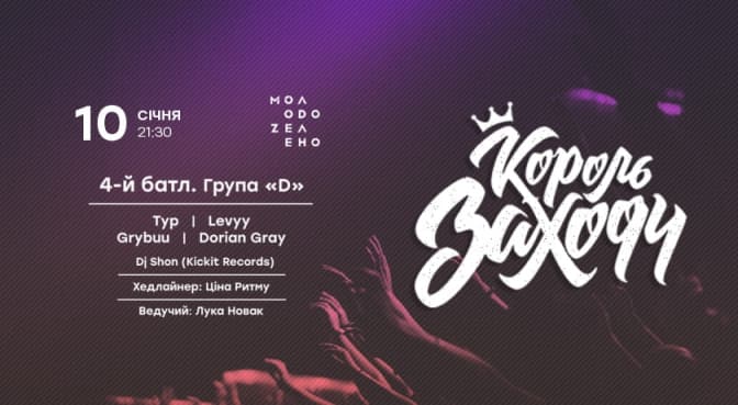 Перший україномовний реп-батл у Львові. Троє львівських МС Dorian Gray, Тур, Levyy MC і репер з Івано-Франківська Grybuu позмагаються за звання переможця в групі D. Хедлайнер вечора – реп-гурт «Ціна ритму».