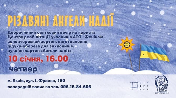 Львів’ян закликають спільно з волонтерами допомогти українським військовим. У програмі – вертеп і прикрашання різдвяного дідуха. Також запланований аукціон, а виручені кошти віддадуть на Центр реабілітації учасників АТО «Фенікс».