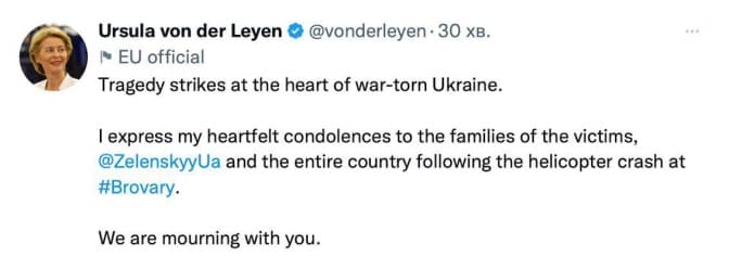 «Трагедія сталася в самому серці розтерзаної війною України. Висловлюю щирі співчуття родинам загиблих, Зеленському та всій країні у зв'язку з катастрофою гелікоптера під Броварами. Ми сумуємо разом з вами», – написала вона.