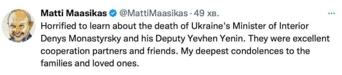 Посол ЄС в Україні Матті Маасікас зазначив, що дізнався про смерть Монастирського та його заступника Єніна з жахом. Він назвав їх чудовими партнерами по співпраці та друзями.