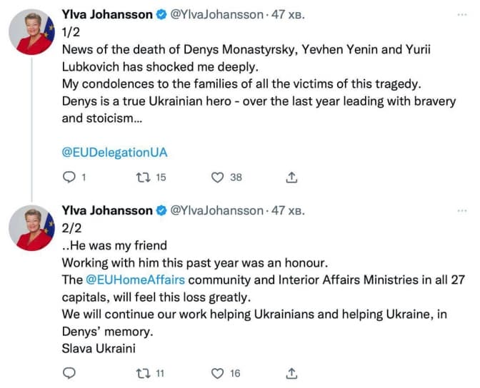 Комісар ЄС із внутрішніх справ Ілва Йоганссон також висловила співчуття та назвала Монастирського справжнім українським героєм і другом, працювати з яким було честю.