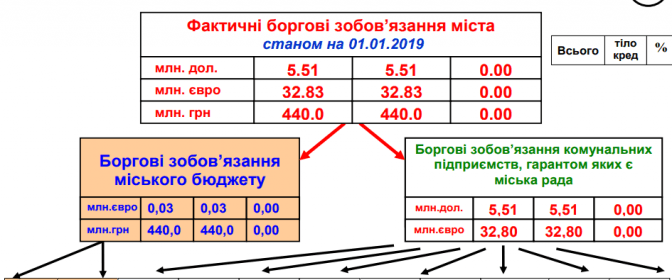 Так, місто боргує 5,51 млн доларів, 32,83 млн євро та 440 млн грн. Валютні кредити оформлені на низку міських комунальних підприємств, а міська рада виступає в цих угодах гарантом.
