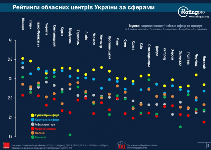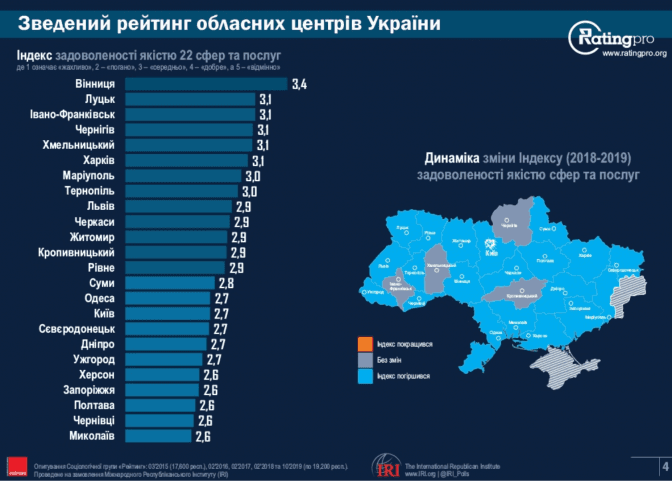 Львів опустився у всеукраїнському рейтингу комфортності міст, який щороку складає соціологічна група «Рейтинг». Опитування проводили з 6 вересня по 10 жовтня у всіх підконтрольних обласних центрах. У ньому взяли участь 19,2 тис респондентів. Статистична похибка для кожного міста не перевищує ±3,5%.