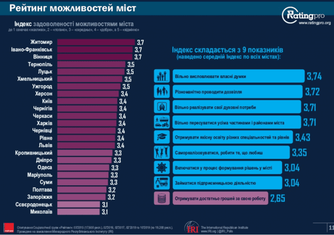 У рейтингу можливостей міст Львів взагалі опинився на 15 місці за показниками вільного висловлювання власної думки, реалізувати духовні потреби, проводити дозвілля, пересуватися різними частинами міста, долучатися до прийняття рішень у місті та отримувати достатню зарплатню.