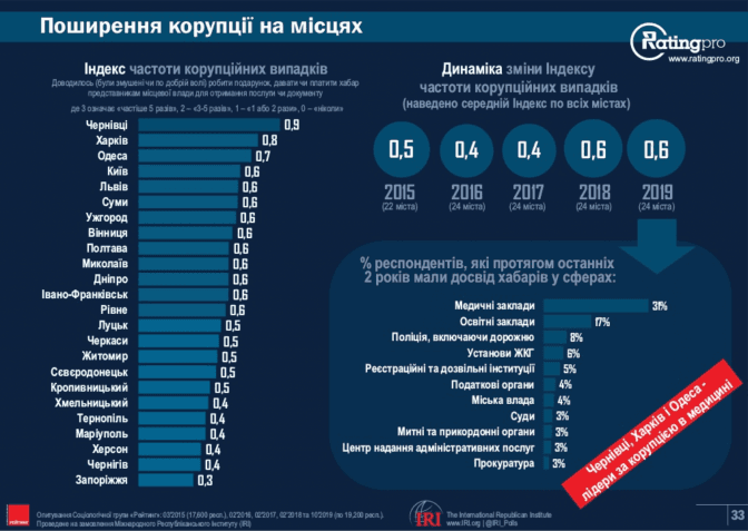 Також «Рейтинг» дослідив рівень корупції у містах. За цим показником Львів потрапив на 5 місце.
